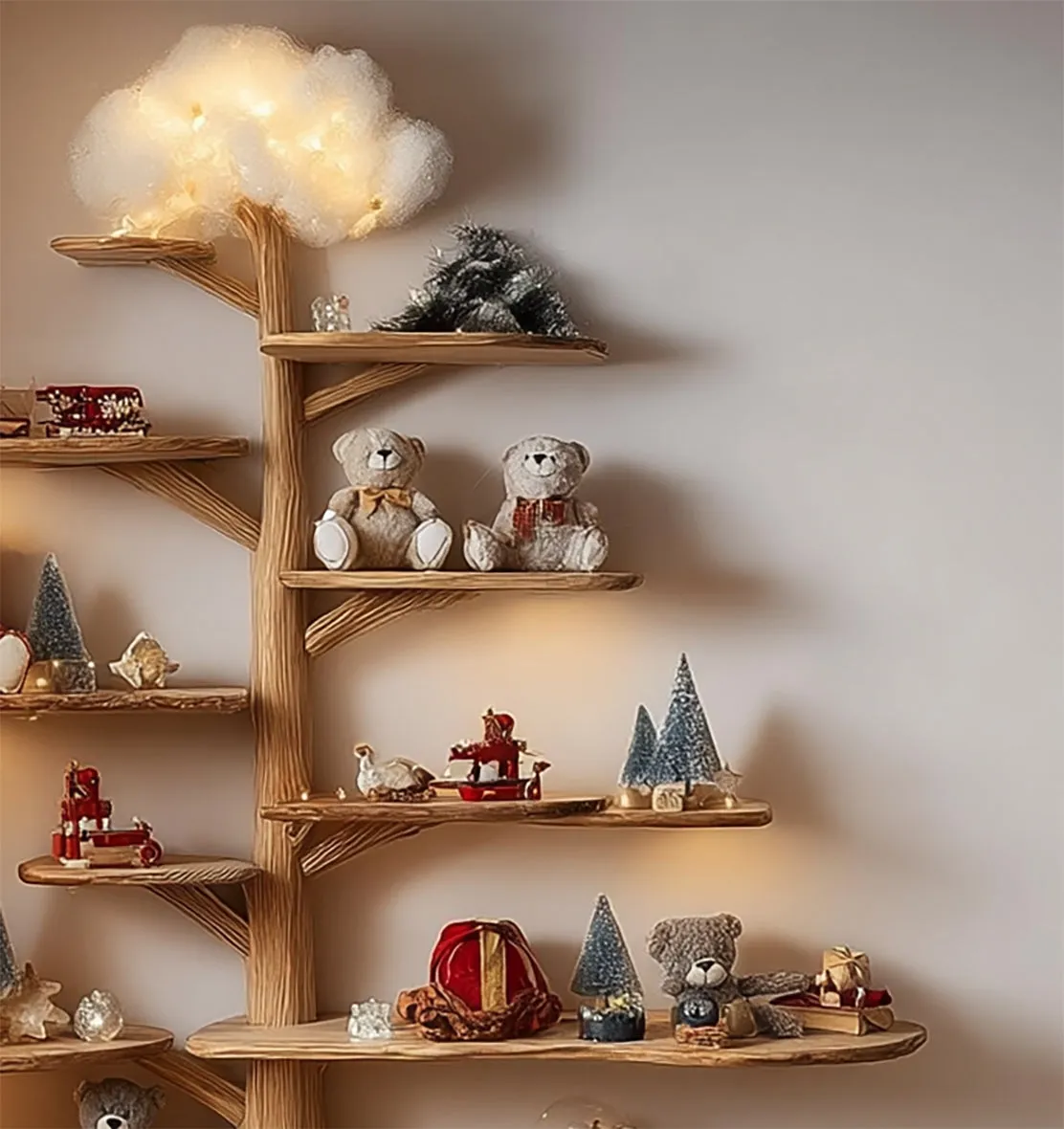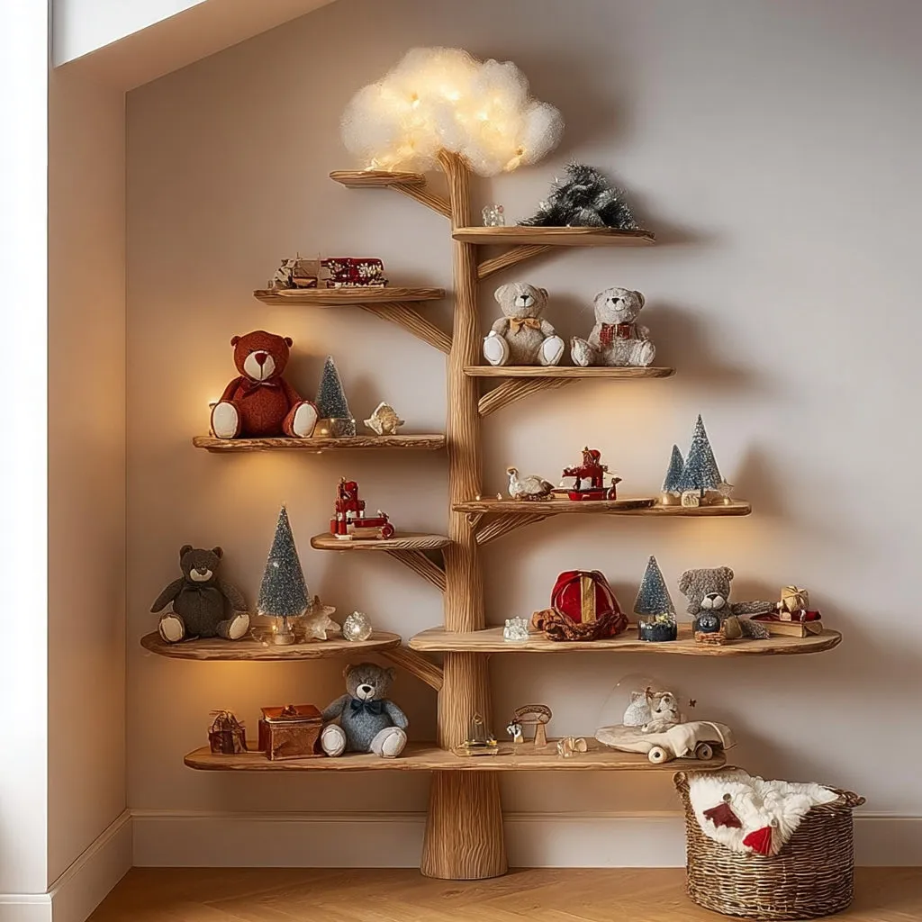 A nursery wall shelf offers gentle order for baby books and small mementos. The branch pattern rises softly while keeping items within easy reach.